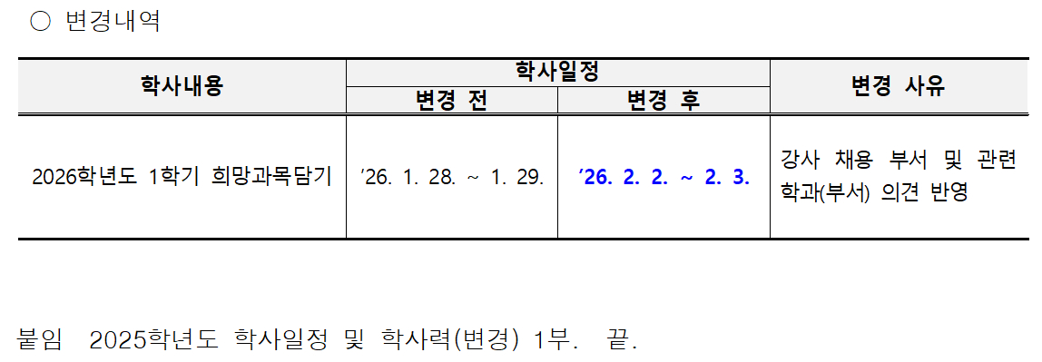 2025학년도 학사일정 및 학사력 일부 변경 알림
